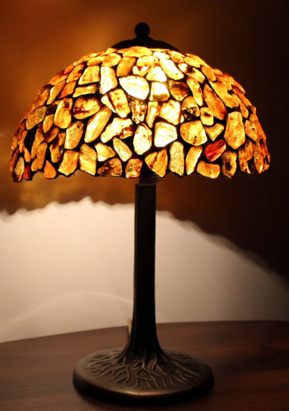 Lampa wykonana jest z naturalnego bursztynu łączonego metodą Tiffanego za pomocą cyny.